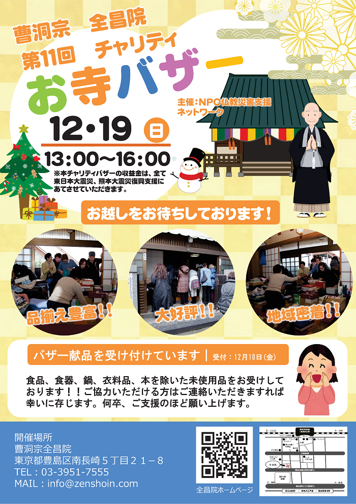 全昌院 お寺チャリティバザー例年6月と12月に実施しております全昌院お寺チャリティバザー。6月16日に実施し、無事終了いたしました。参加者は15名ほどで、常連の方を中心にご新規の方もちらほらおられました。お寺は生きている間にくる場所ですお寺は宗教施設であり、祈りの場であると同時に、地域にひらかれたコ...