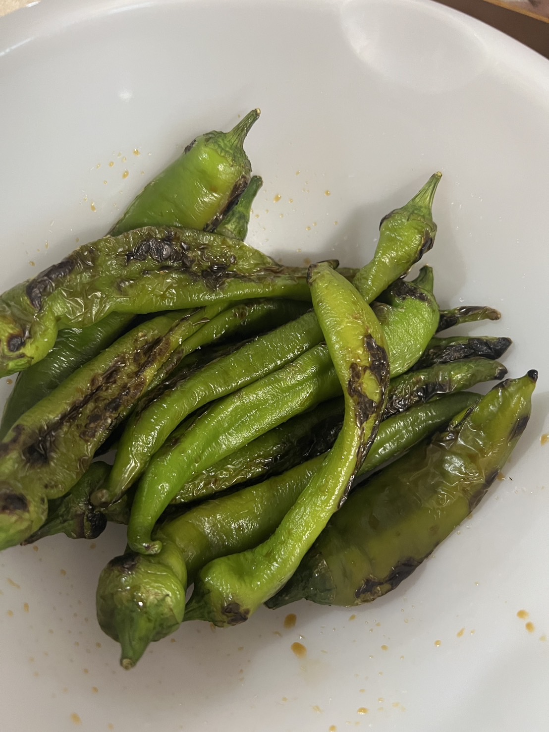 おおぶりで甘みがある万願寺とうがらしは、そのまま焼くだけでもとても美味しく、まずは種ごと素焼きに致しました。